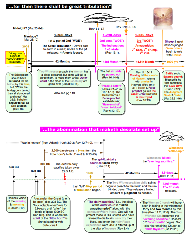 The math in this equation looks like this: 1,260-days + 30 = 1,290 + 45 = 1,335 total days (Rev 11:3; Dan 12:11-12) for the great tribulation, the indignation, and the battle of Armageddon: God’s fierce wrath to have taken place. Do you see how these progressive time periods fit into the different periods or degrees of ever increasing end-time judgments spoken of in the Bible? It would be good for you to read all of the verses pertaining to these periods and study them out carefully, but for now let us continue on.